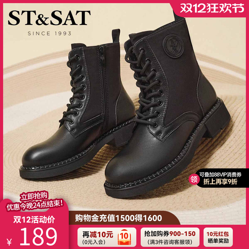 星期六真皮白色马丁靴女靴秋冬加绒保暖粗跟厚底系带英伦风短靴子