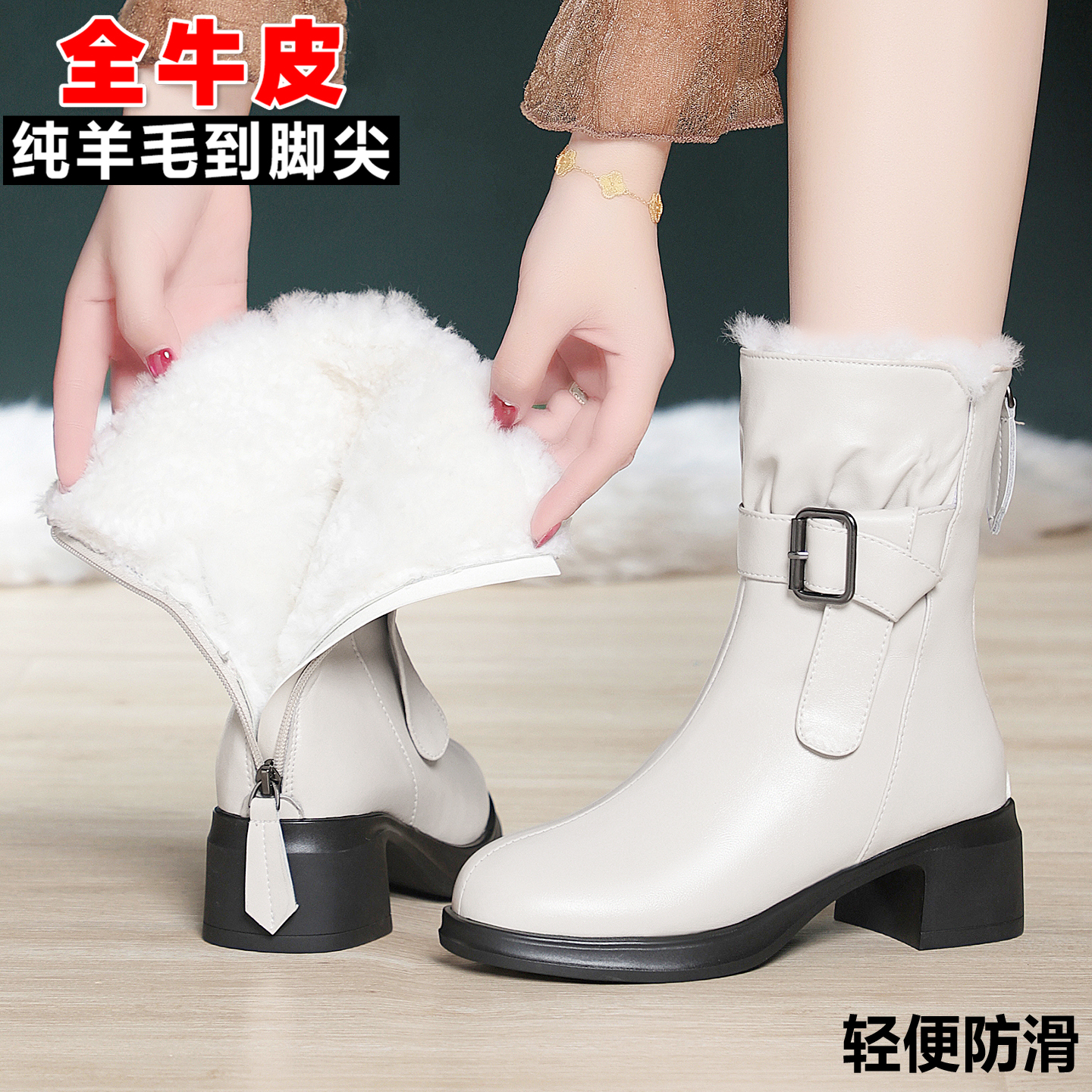 白色高跟短靴冬季加绒加厚女士靴子真皮羊毛棉鞋皮毛一体雪地棉靴