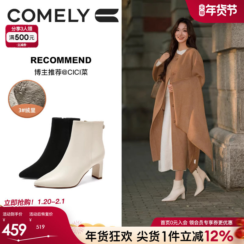 新闻女王佘诗曼同款康莉高跟白色短靴女冬新款真皮气质尖头瘦瘦靴