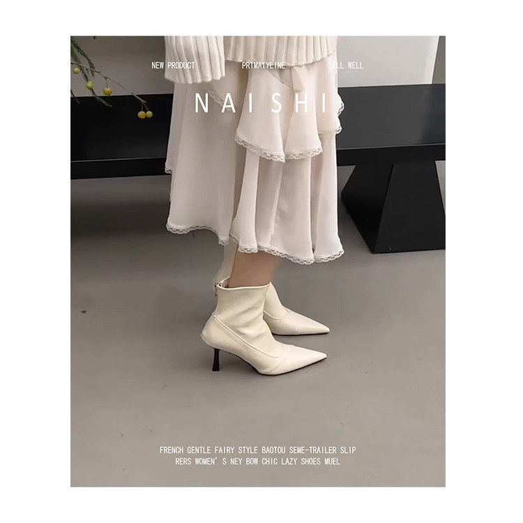 羊皮版!法式尖头高跟靴后拉链细跟白色短靴真皮瘦瘦靴气质弹力靴