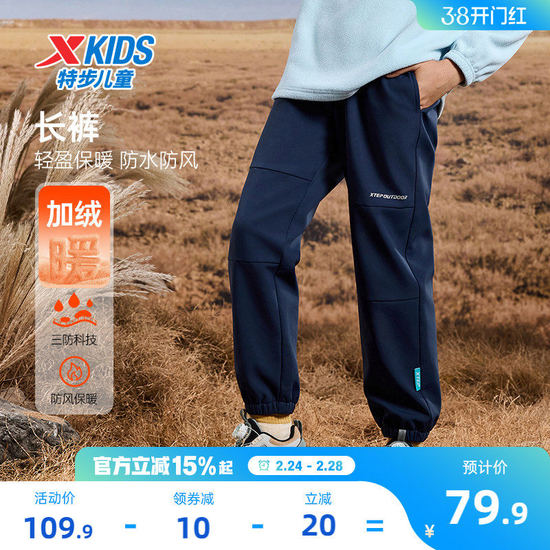 特步童装春季儿童运动裤男童加绒户外长裤大童三防梭织保暖裤春装