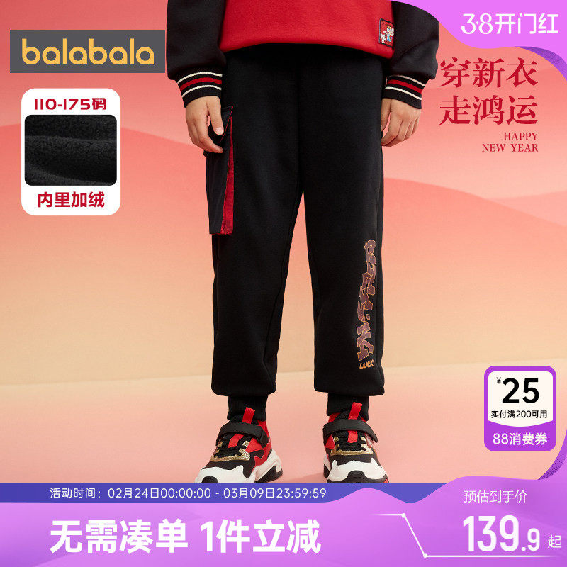 巴拉巴拉男童加绒运动裤中大童黑色裤子冬装新款童装儿童新年款厚