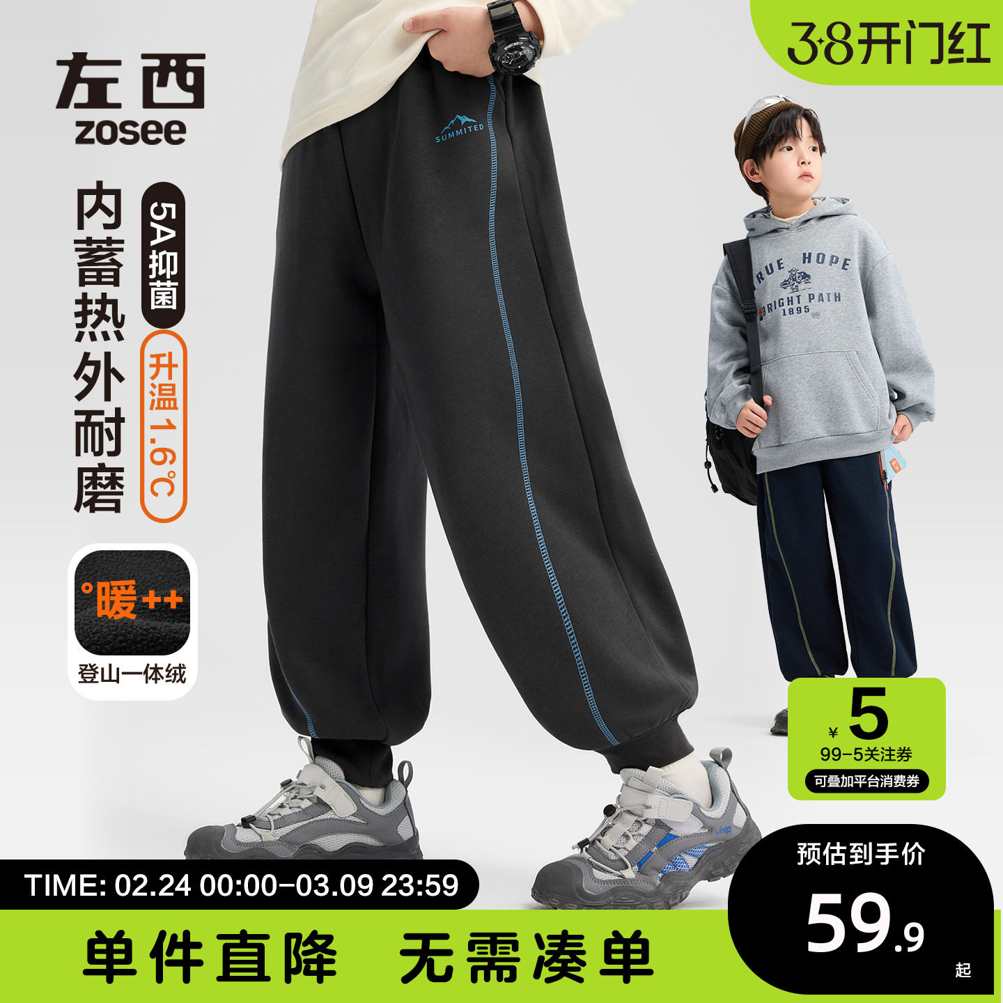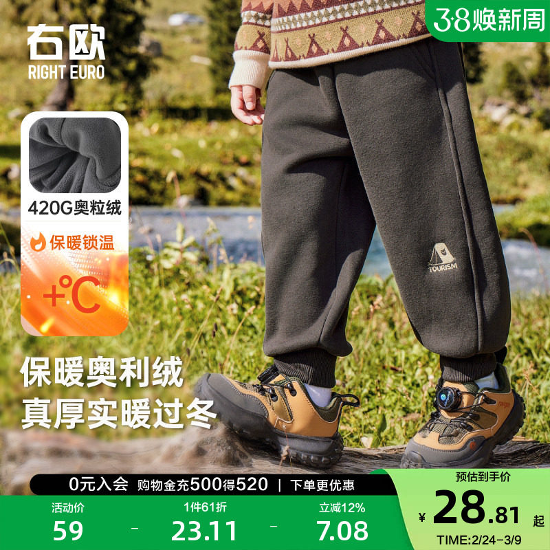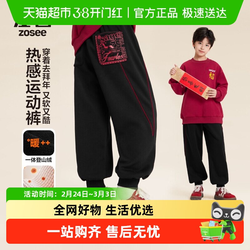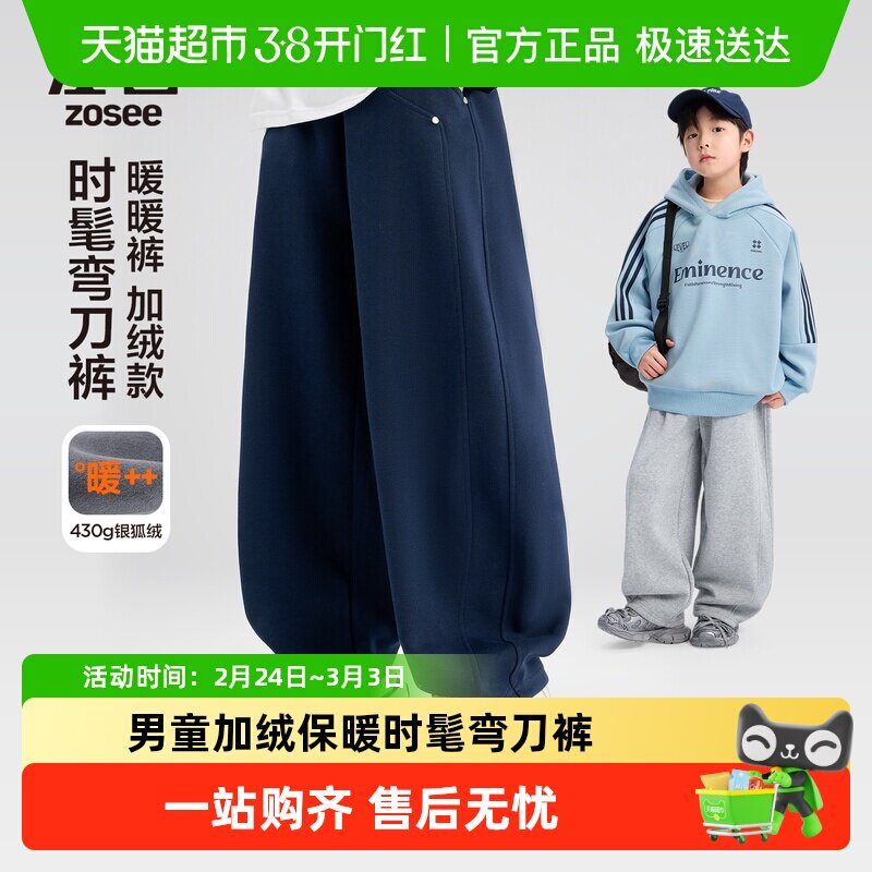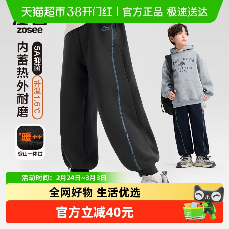 左西童装男童加绒运动裤冬季儿童一体绒蓄热弯刀裤2026新款裤子潮