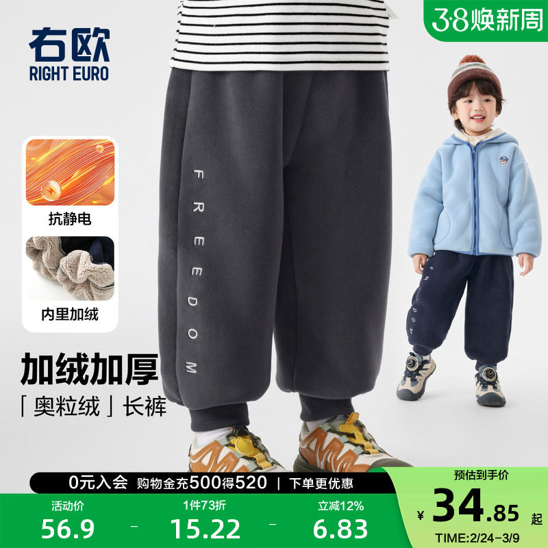 右欧男童加绒运动裤女童卫裤秋冬新款童装字母时髦儿童保暖长裤子