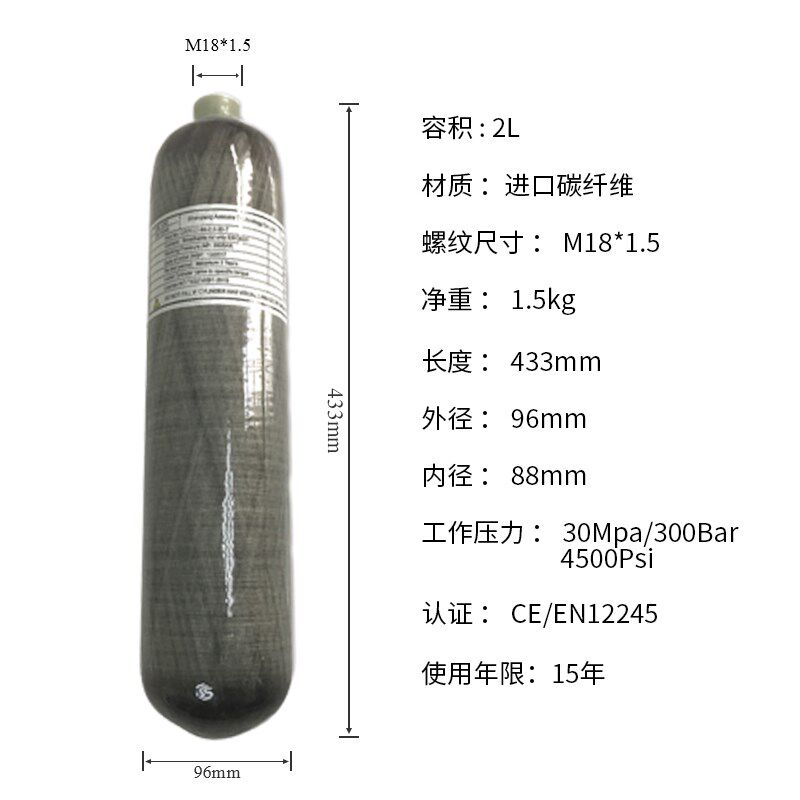 碳纤维高压气压瓶2L复合气瓶玻璃缠绕无缝30MPa压缩空气瓶潜水瓶