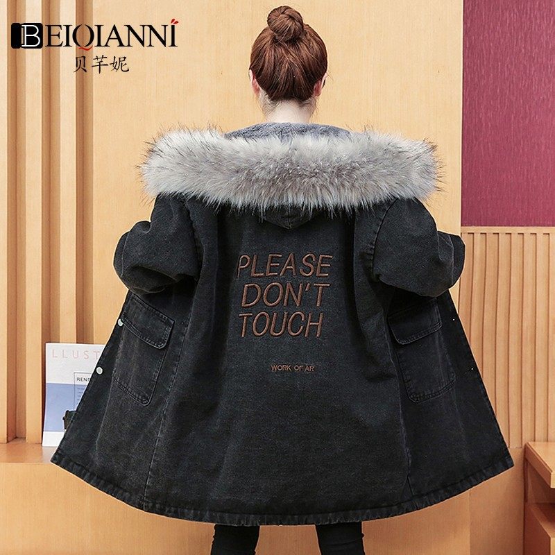 2021新款加绒加厚牛仔外套女中长款大码棉服刺绣韩版宽松冬装棉衣