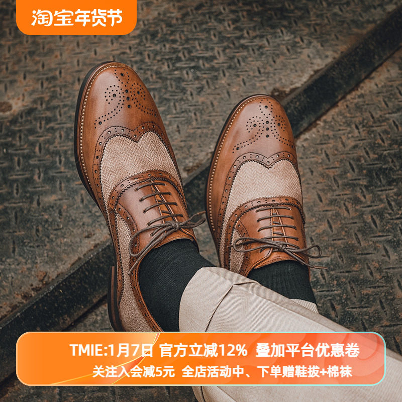 新品英伦商务正装皮鞋男士潮流手工复古真皮布洛克雕花牛津鞋青年