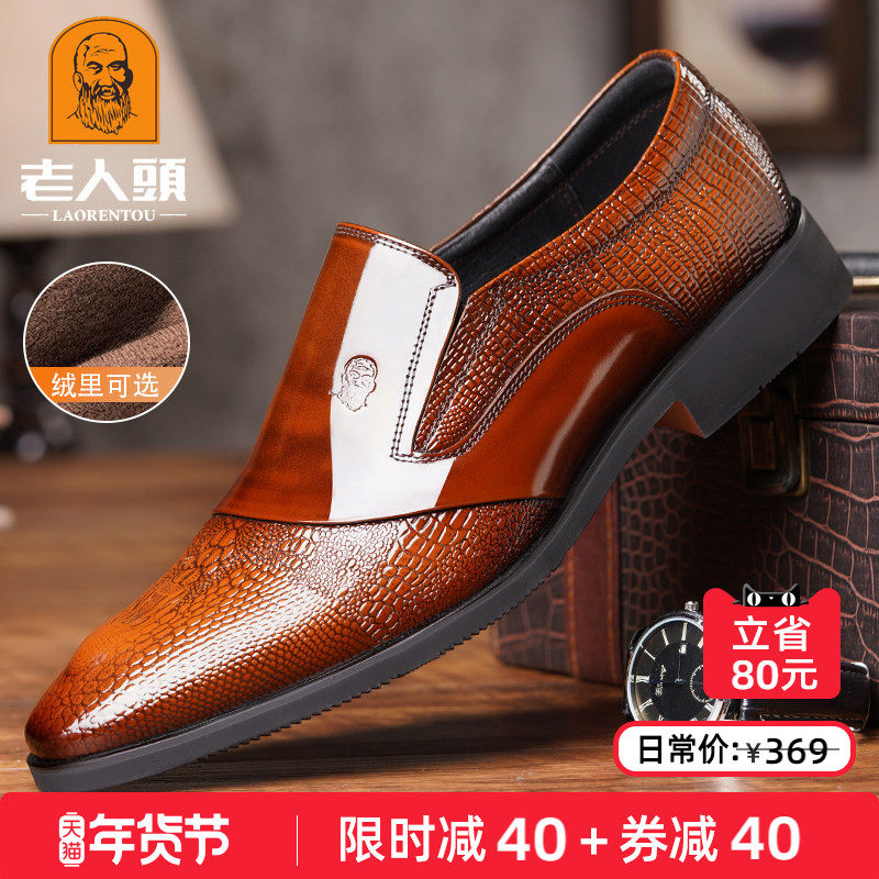 老人头秋冬男鞋真皮英伦商务正装皮鞋男尖头保暧加绒婚鞋增高皮鞋