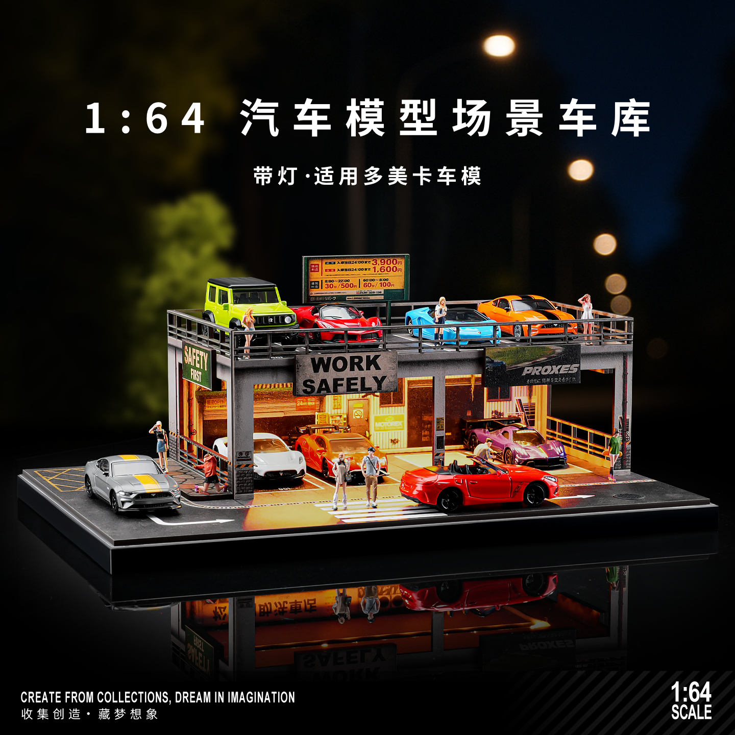 1:64车模停车场车库模型适用多美卡合金车玩具车展示盒收纳架带灯
