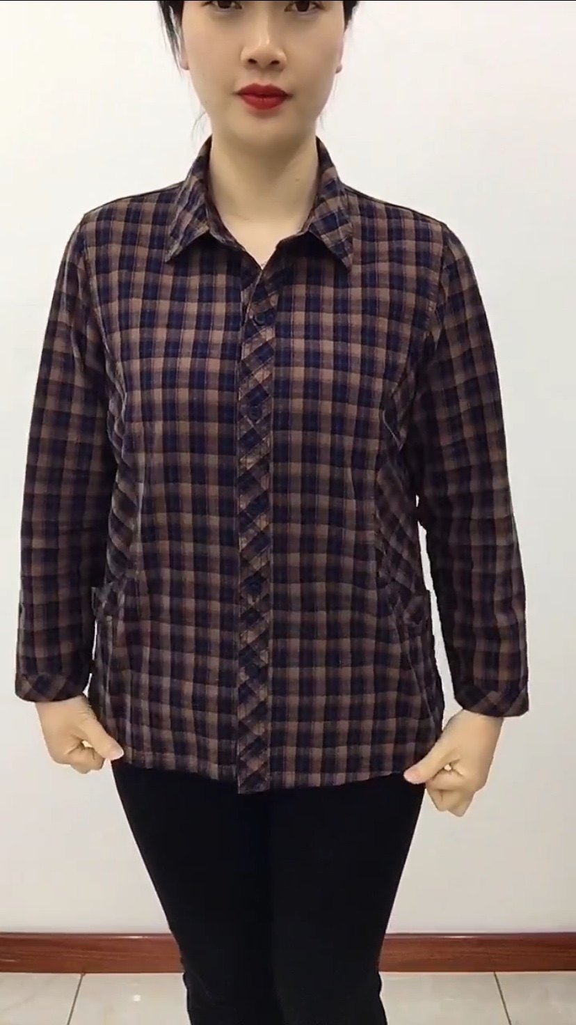 妈妈春装九分袖棉布衬衫中年妇女磨毛全棉衬衣格子中老年女装开衫