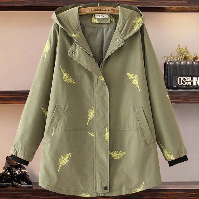 40岁中年女装春装中长款羽毛印花连帽宽松显瘦风衣春季胖妈妈外套