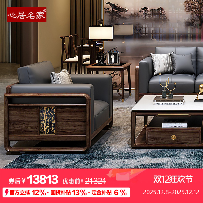 心居名家 新中式实木沙发组合乌金木客厅123人位高端轻奢头层真皮