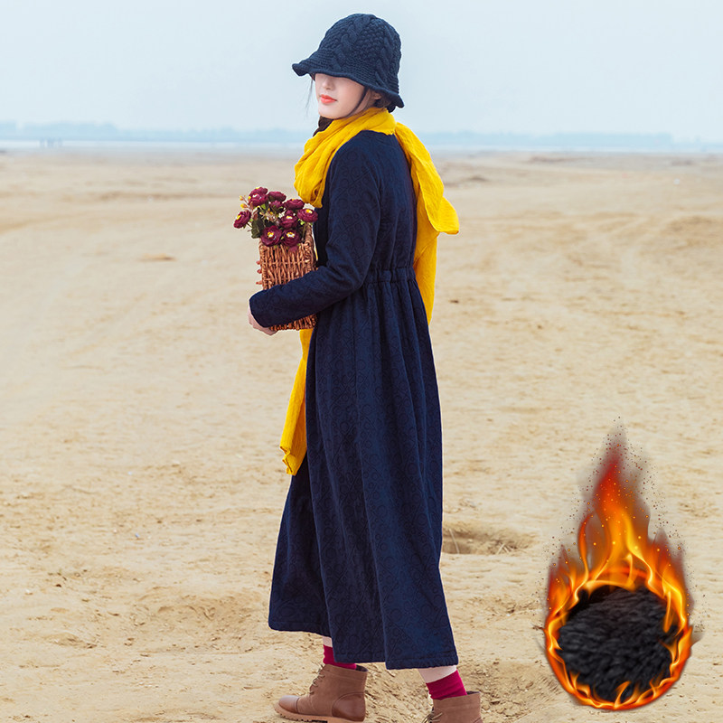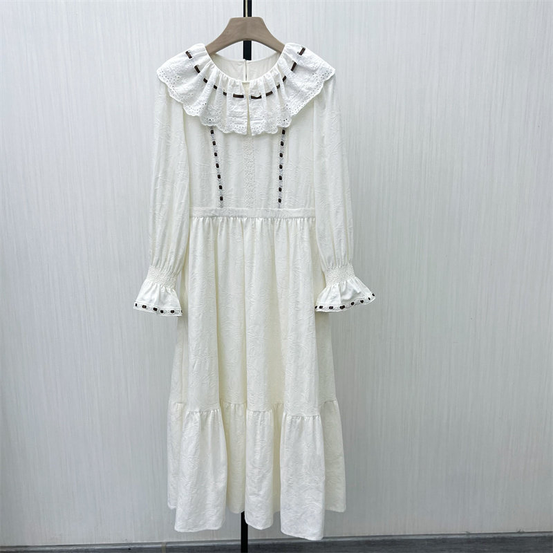 2025春新款复古文艺小清新纯色全棉提花连衣裙女修身显瘦长袖长裙