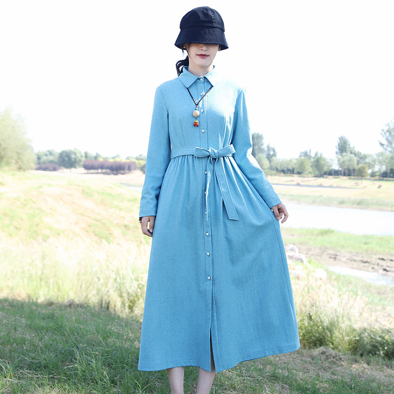 复古文艺小清新纯色毛呢连衣裙女装收腰显瘦气质单排扣风衣裙长裙