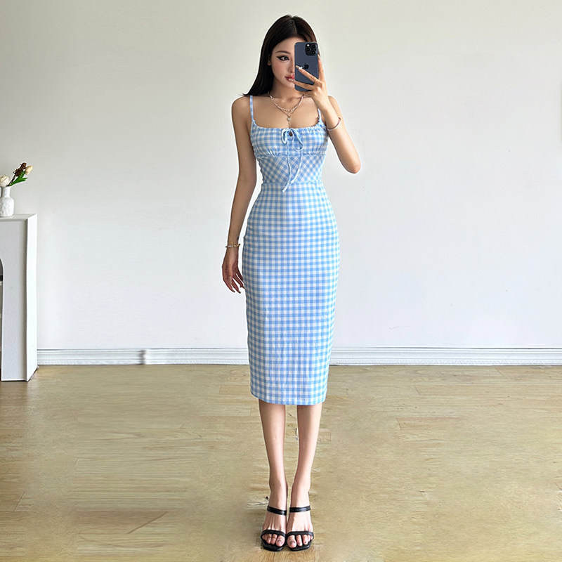 KLIOU 法式田园小清新复古格纹吊带连衣裙女气质收腰显瘦中长裙潮