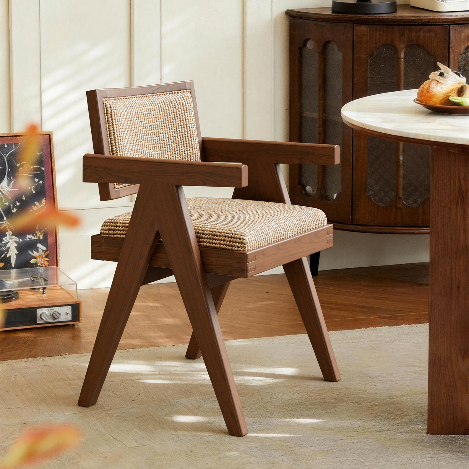白蜡木中古法式复古实木餐椅昌迪加尔藤编椅家用扶手椅餐桌靠背椅
