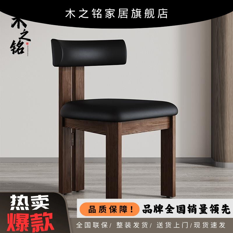 法式复古实木餐椅家用餐厅新款网红黑色胡桃真皮侘寂卧室化妆椅子