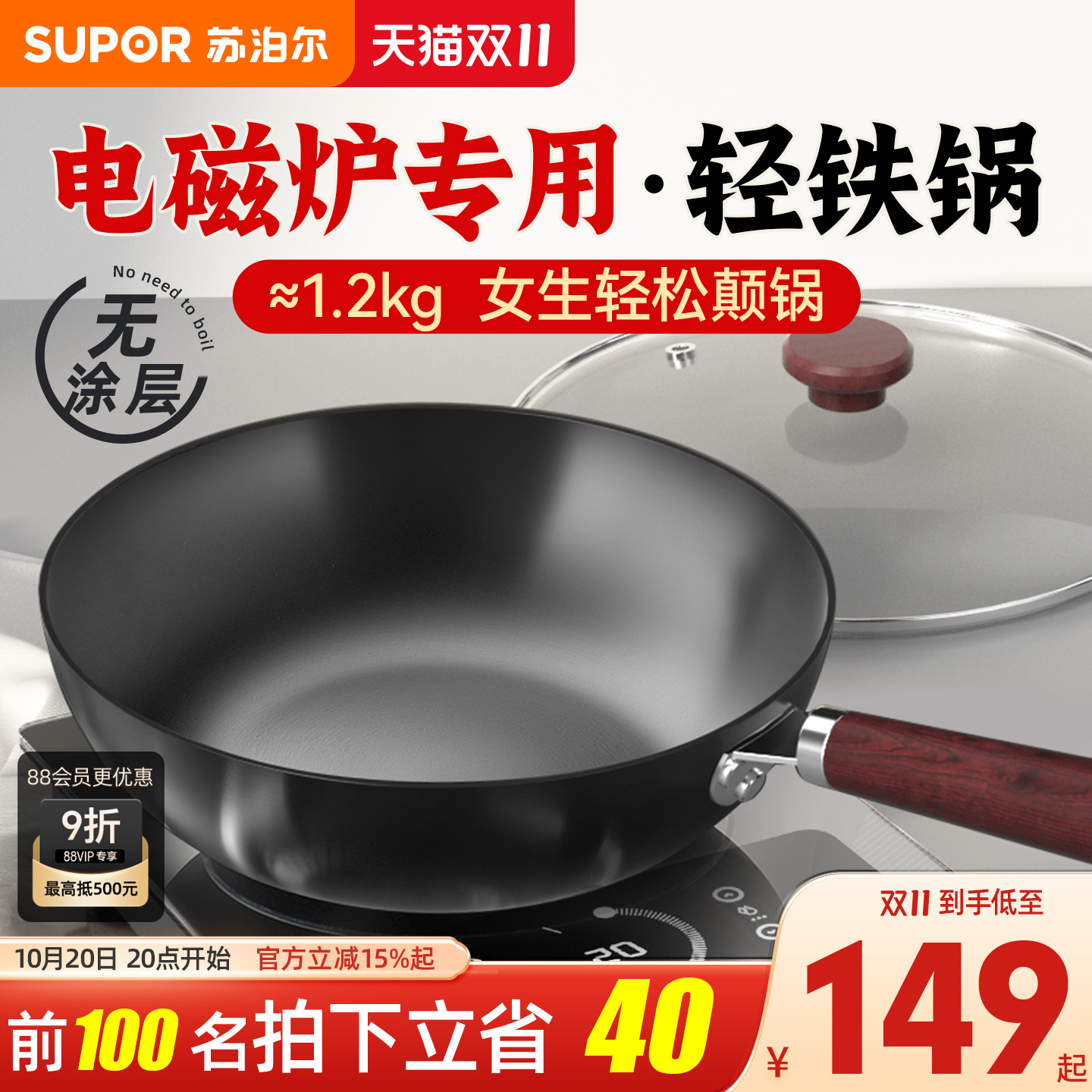 苏泊尔铁锅炒锅家用老式炒菜锅无涂层电磁炉燃气灶通用锅具免开锅