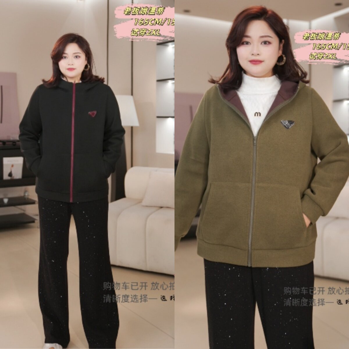 PWD33348【现货仅外套】秋冬连帽宽松显瘦大码女装外套【衣长70】