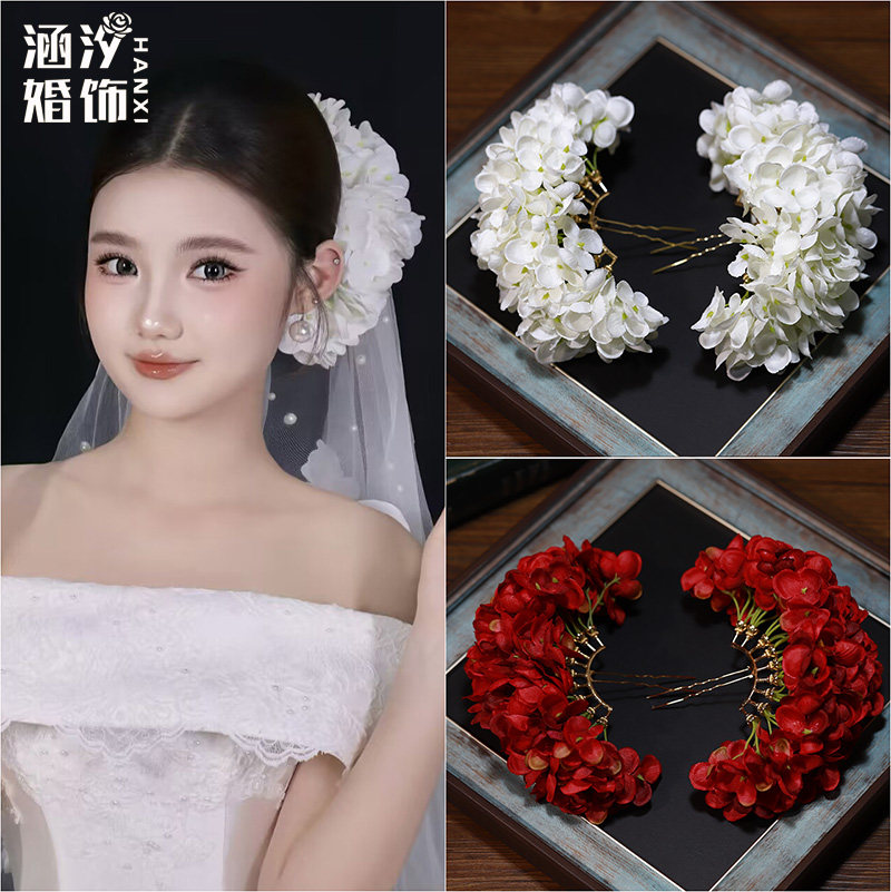 新品森系白色绣球花朵发簪新娘结婚纱头饰配饰摄影高级感百搭发饰