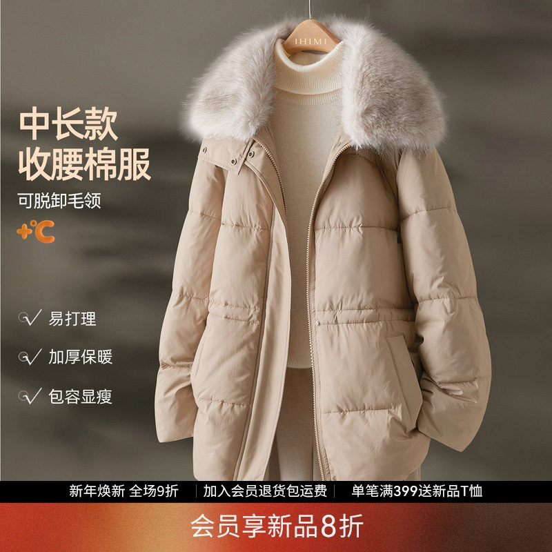 2025冬大毛领修身显瘦中长款棉服女士加绒加厚保暖洋气外套棉衣潮
