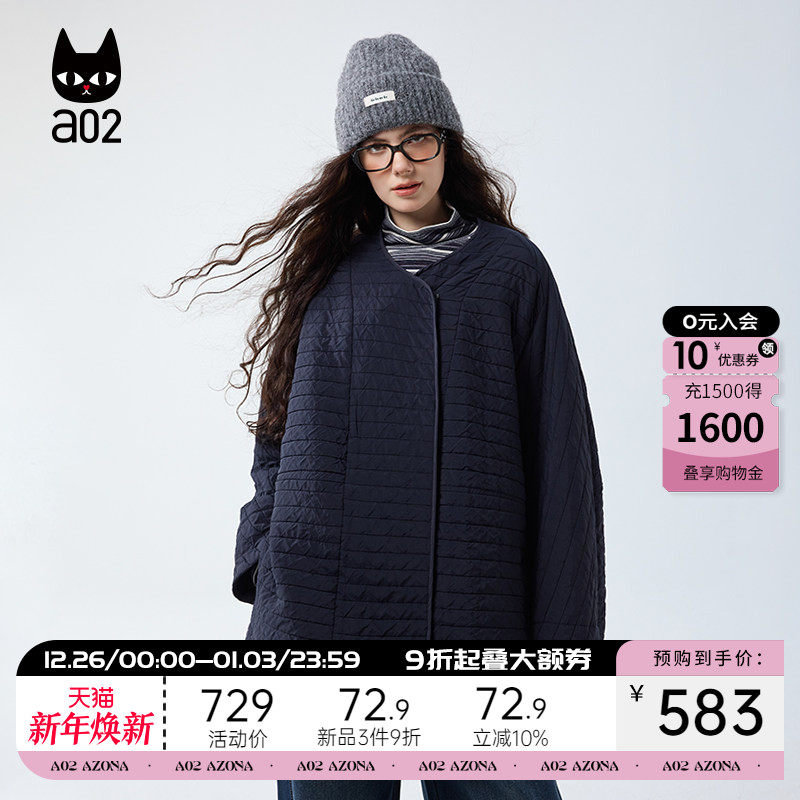 a02宽松V领中长款棉服女2025新款冬季保暖加厚棉衣外套冬装防风