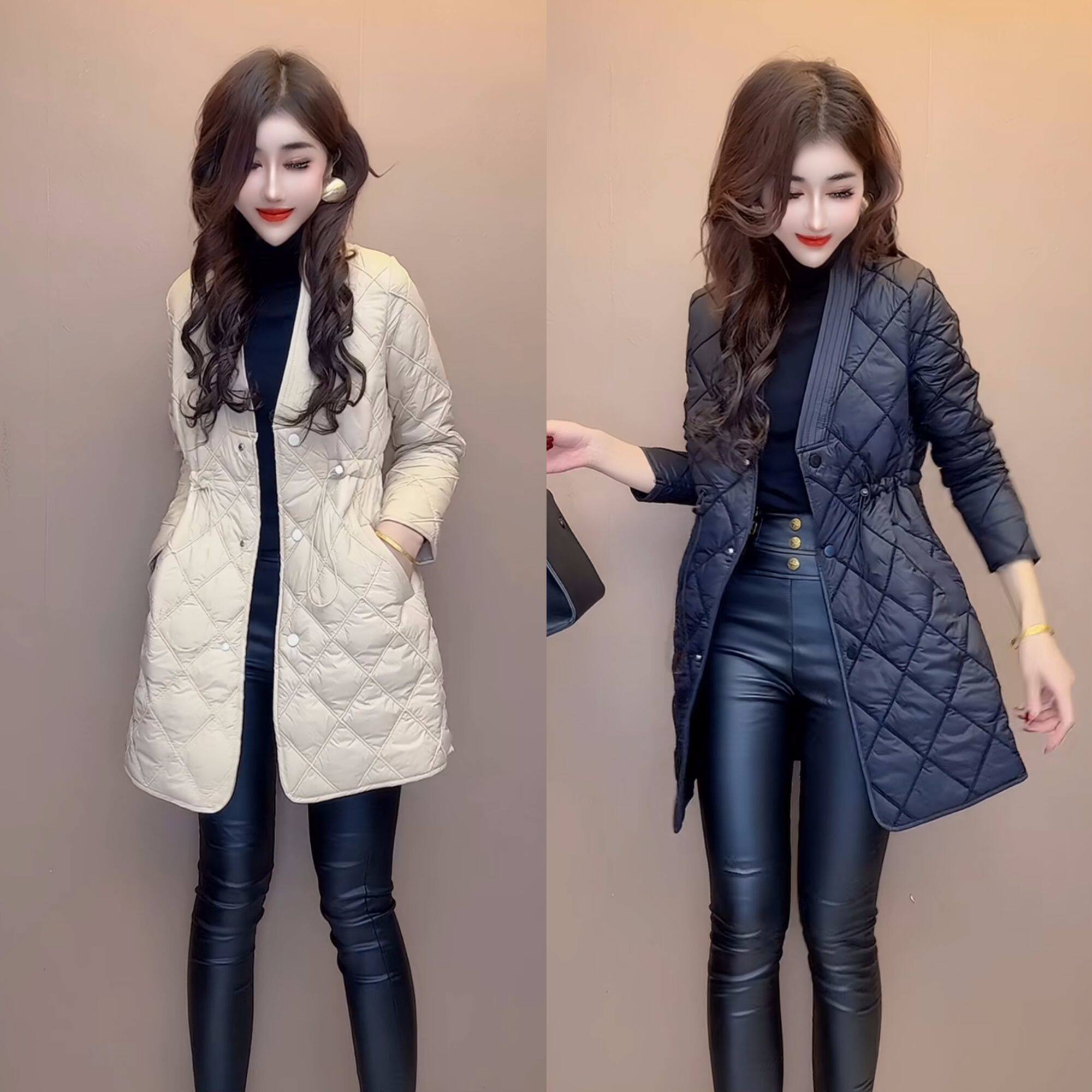 V领压格韩版中长款棉服女冬季保暖二棉服收腰显瘦洋气外套上衣潮