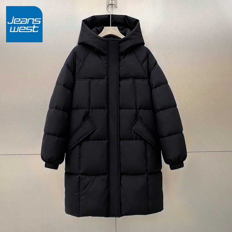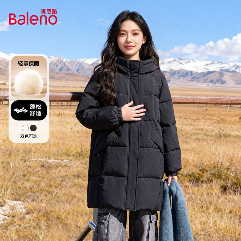 班尼路白色连帽中长款棉服女2025冬季新款加厚保暖过膝百搭棉袄Q