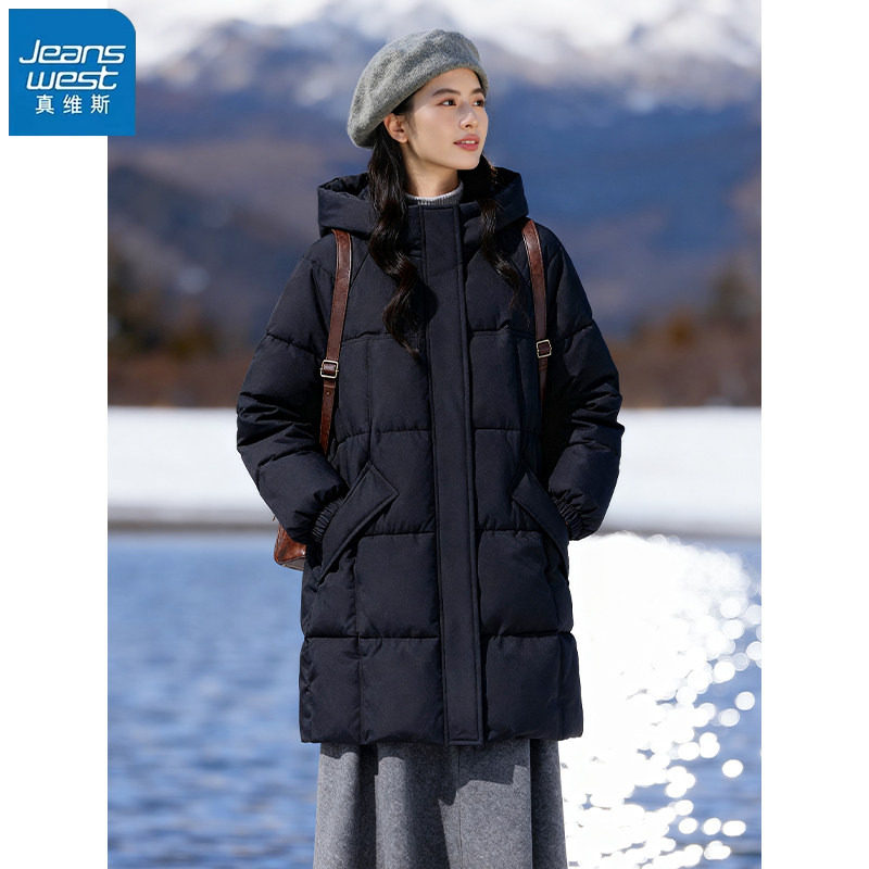 KHV真维斯黑色连帽中长款棉服女冬季新款2025巨好看的棉袄厚外套