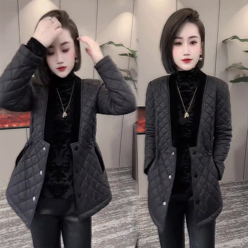 冬季V领压格韩版中长款棉服女保暖二棉服收腰显瘦洋气外套上衣潮