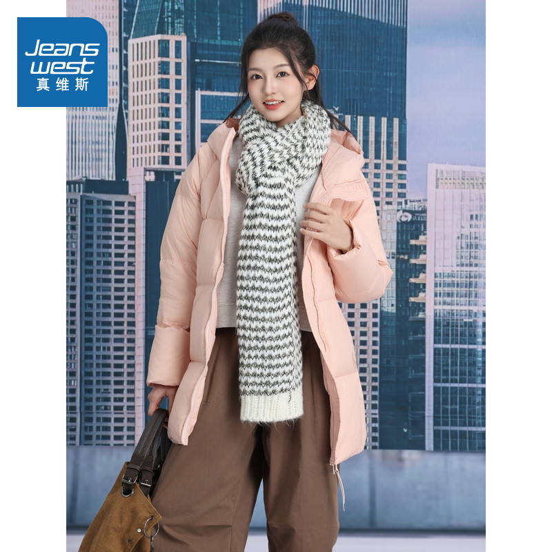 LE真维斯中长款棉服女2025冬季新款粉色保暖棉袄女士连帽高级外套
