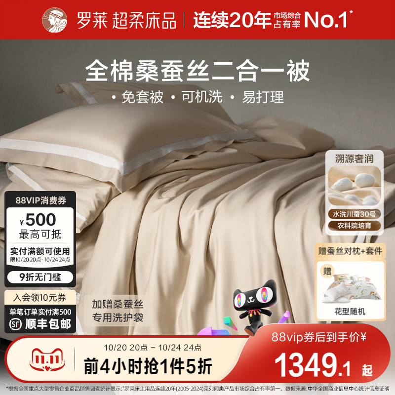 罗莱家纺全棉蚕丝被子100桑蚕丝春秋被二合一子母喜被芯结婚陪嫁