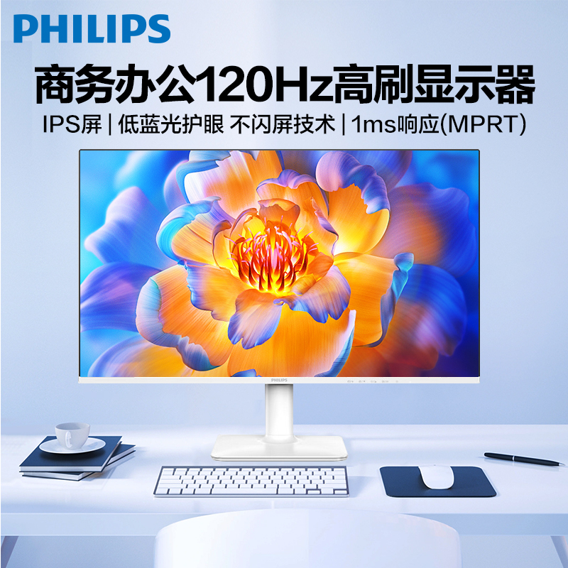 飞利浦商务办公显示器23.8英寸120hz低蓝光护眼27''女款白色荧屏