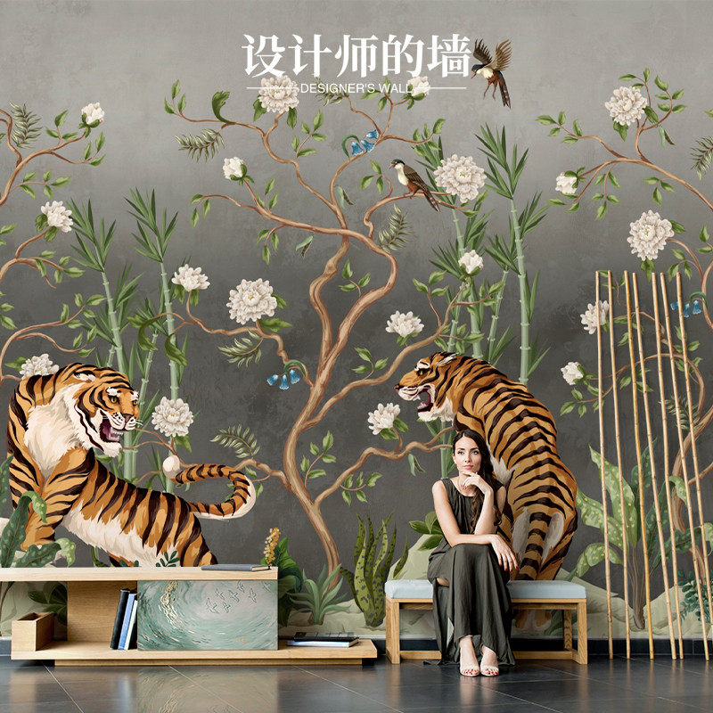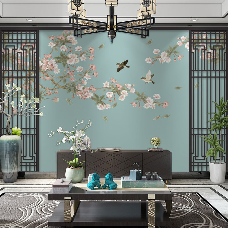 新中式壁纸墙纸玄关客厅沙发电视背景墙卧室壁布花鸟V影视墙壁画3