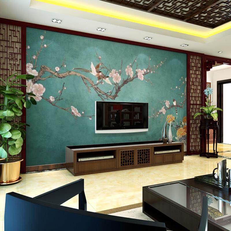 3d新中式电视背景墙壁纸梅花古风大气壁布客厅影视墙壁画墙布花鸟