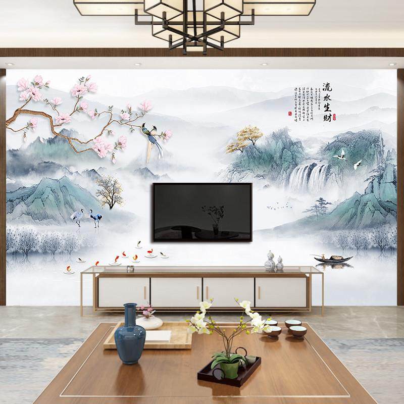 新中式山水画电视背景墙壁布3d立体墙布影视墙壁画定制8d新款壁纸