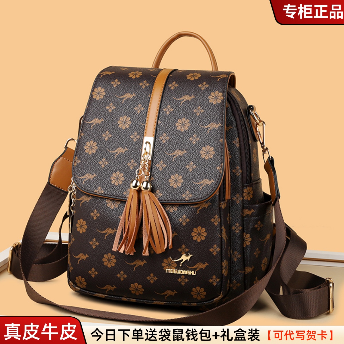 正品袋鼠双肩包女休闲旅游背包2025新款真皮妈咪包大容量时尚百搭