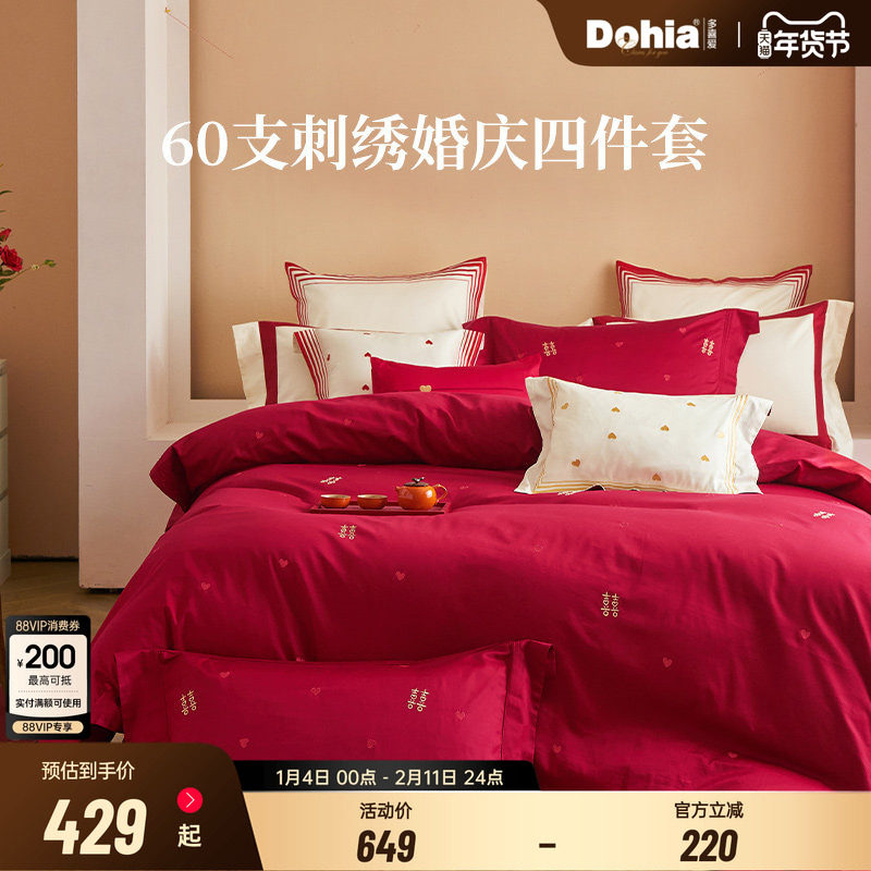 雅鹿家纺纯棉四件套结婚全棉六件套婚庆喜被大红床上用品婚房陪嫁