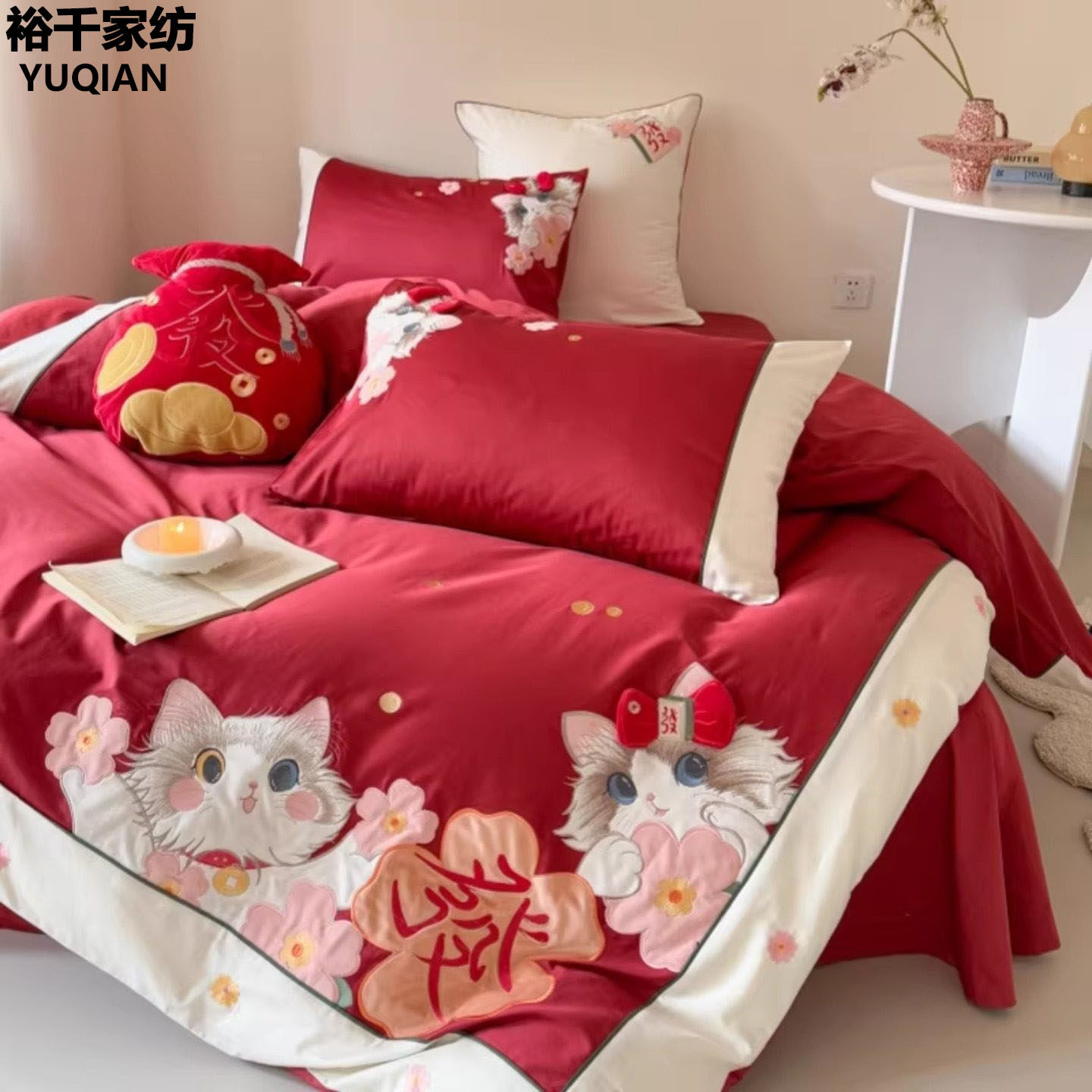 卡通少女心发财猫刺绣冬季纯棉四件套加厚100全棉高级感红色床品
