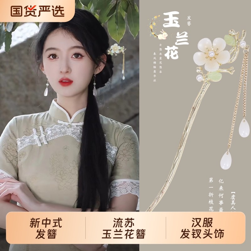 新中式发簪女步摇流苏玉兰花簪子高级感旗袍汉服金属发钗头饰仙气