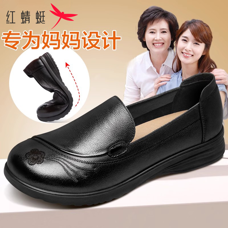 红蜻蜓妈妈鞋春季新款真皮女鞋老人鞋子舒适软底中老年皮鞋女单鞋