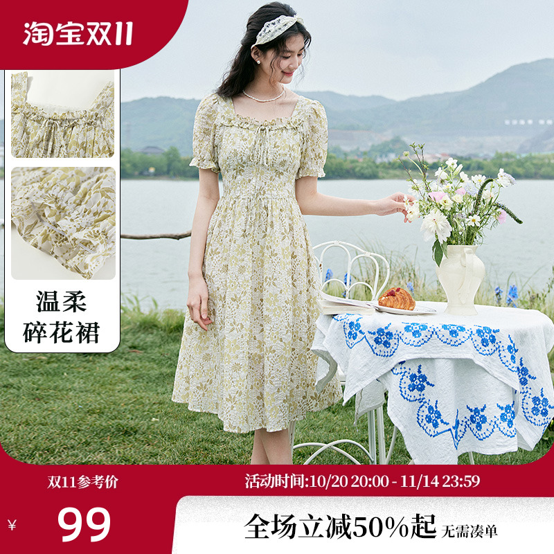 PIT法式连衣裙女夏季新款碎花泡泡袖方领100%棉多巴胺茶歇裙