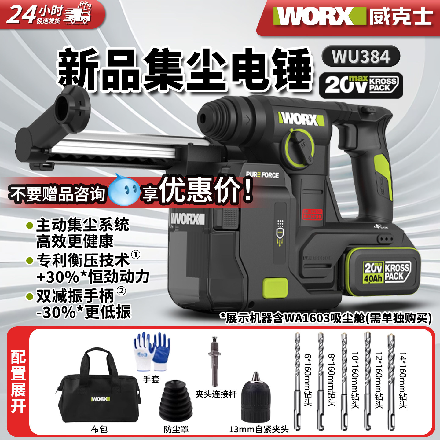 威克士新款WU384集尘电锤无刷锂电冲击钻工业级多功能轻型电钻