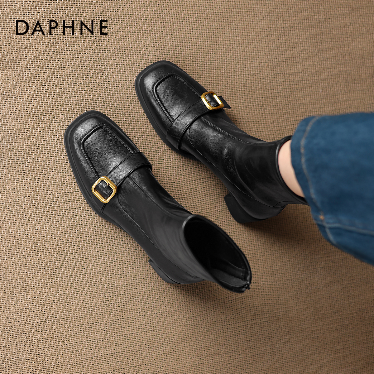 达芙妮方头黑色瘦瘦小短靴2025新款秋冬季女款女士皮靴子马丁女靴