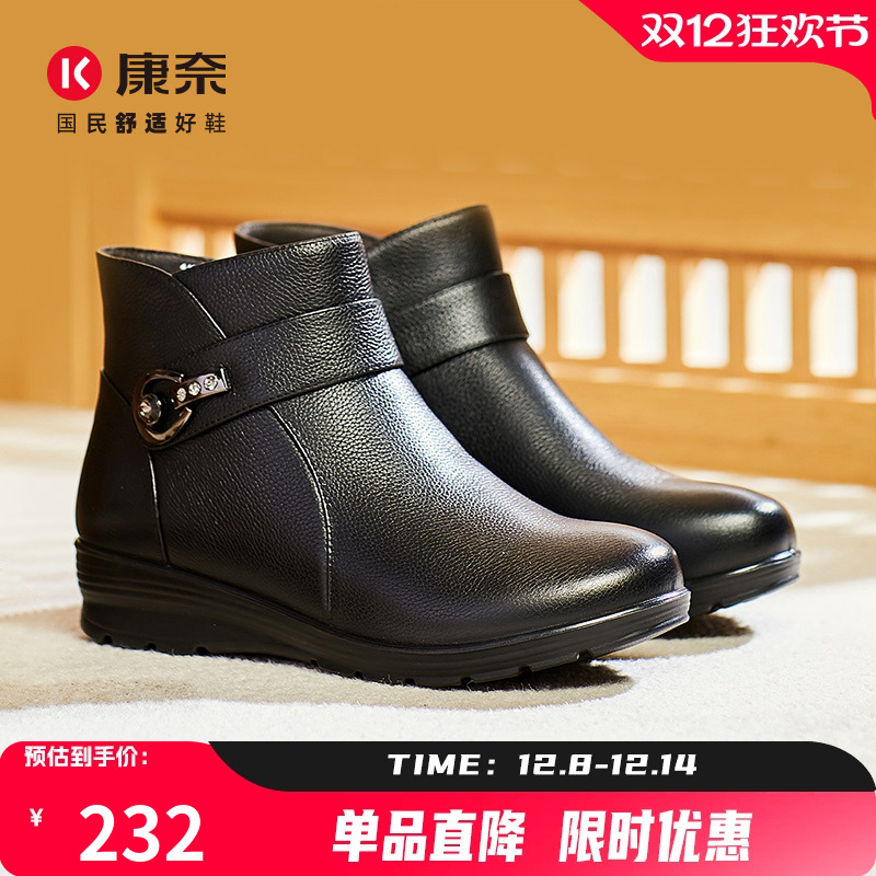 奥康女靴冬季真皮鞋坡跟保暖棉鞋加绒平底短靴舒适冬款妈妈靴皮靴
