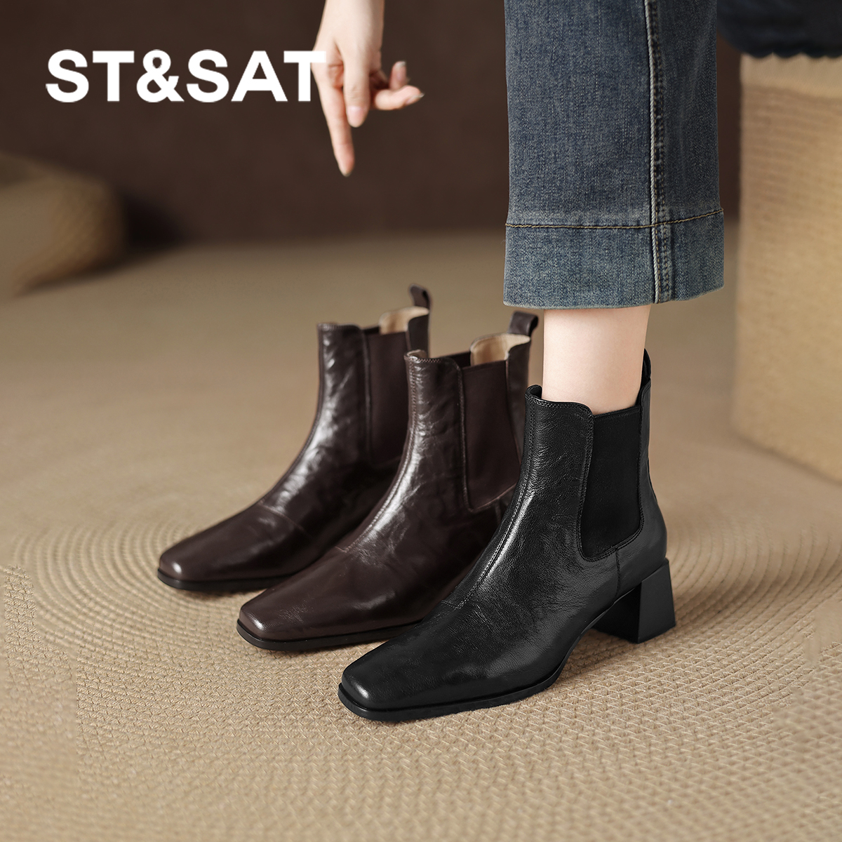 星期六方头瘦瘦小短靴2025新款女款皮靴子切尔西女靴早秋冬季加绒