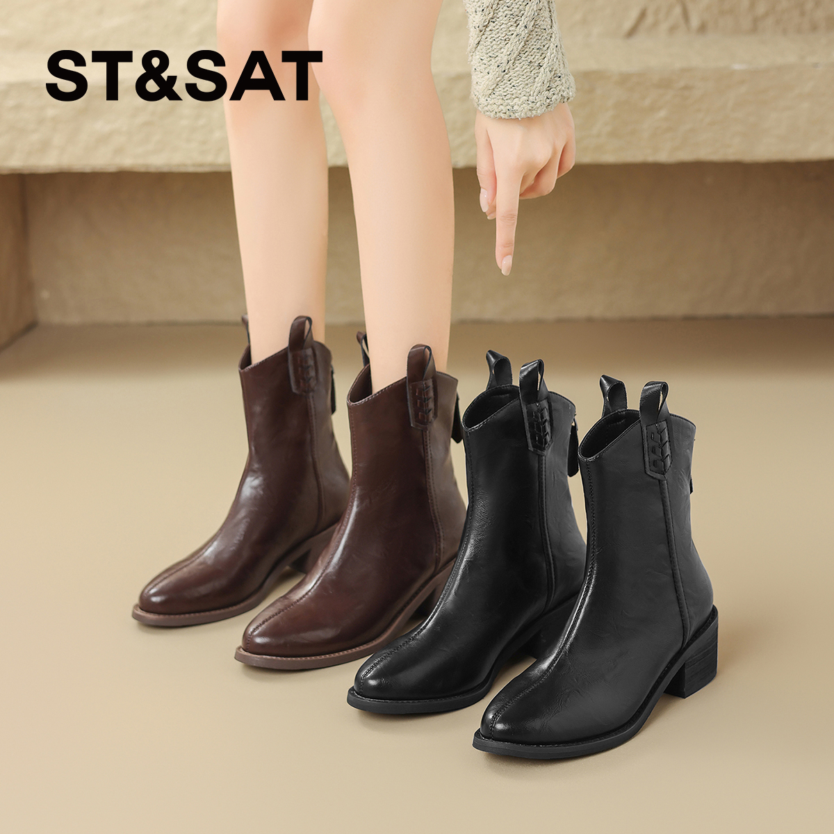 星期六棕色短靴美拉德西部牛仔靴尖头短筒靴高跟皮靴女款靴子女靴