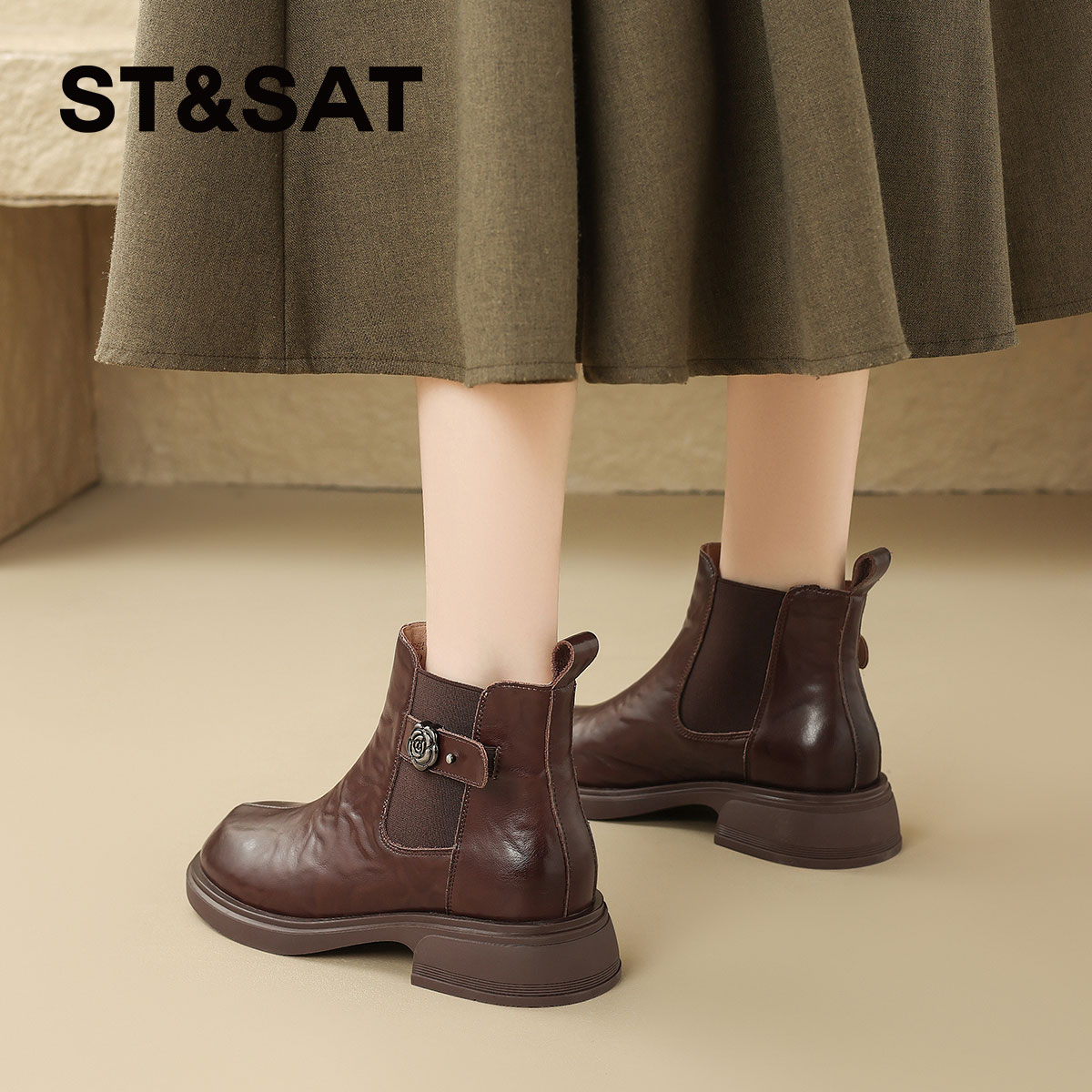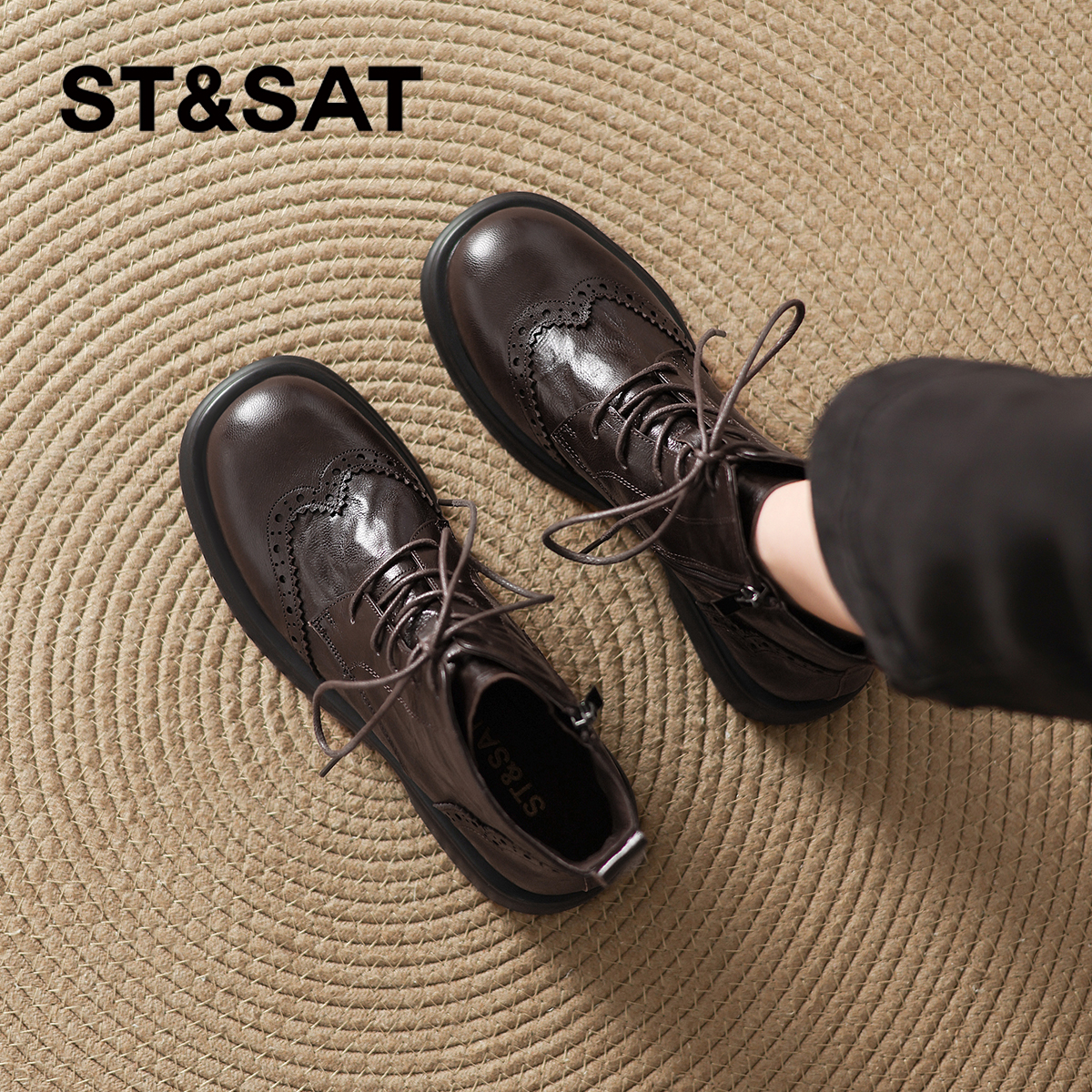星期六真皮靴英伦小短靴2025新款女款棕色马丁女靴子早秋冬季加绒