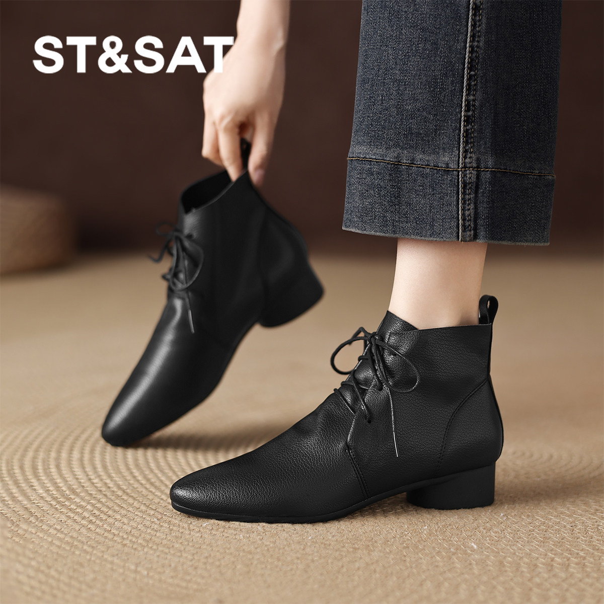 星期六尖头系带马丁小短靴2025新款黑色秋冬季踝靴女款皮靴女靴子