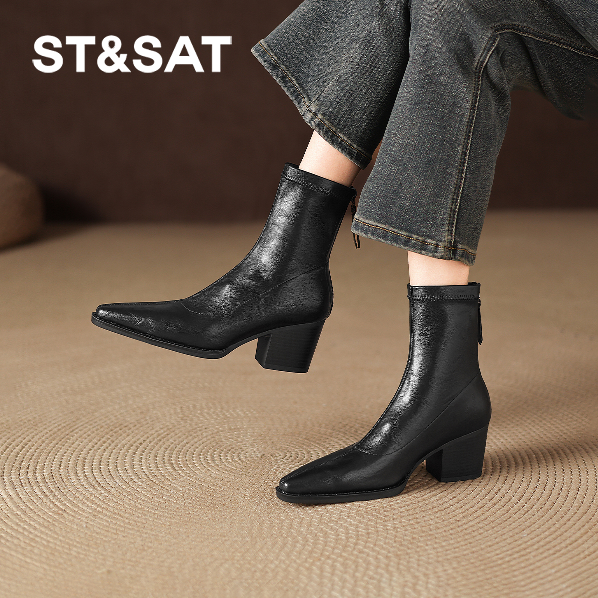 星期六高跟短靴女2025新款冬季尖头靴子法式粗跟瘦瘦女靴女士皮靴